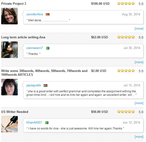 Po koncu vsakega projekta vas delodajalec tudi oceni (ocene od 1-5, ocenjuje pa se: kvaliteta opravljenega dela, način komunikacije z vami, strokovnost, profesionalnost, možnost ponovnega sodelovanja z vami) – ta ocena pa se potem pojavi v vašem osebnem profilu. Zato je zelo pomembno, da se pri vseh projektih držite dogovorjenega časovnega roka in delo opravite kar se da profesionalno, saj boste z veliko pozitivnimi ocenami veliko lažje prišli do novih projektov. V kolikor bodo avtorji oglasa v vašem profilu videli visoke povprečne ocene, se bodo veliko hitreje odločili, da vam ponudijo možnost za delo na domu in dodaten zaslužek. Primer dobrega freelancerja lahko vidite na spodnji sliki: