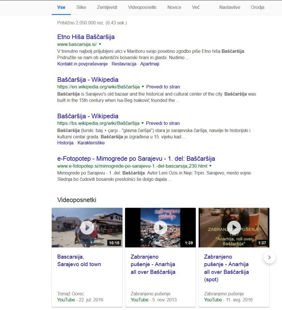 Če v Google.com vpišete ‘Bascarsija’, dobite zadetke, kot jih vidite spodaj na sliki.